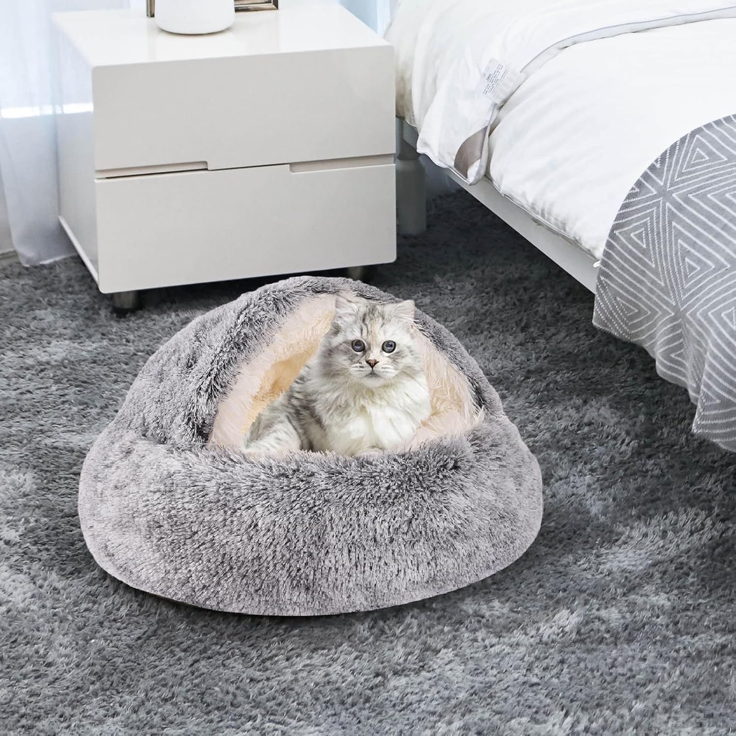 Cat Bed Round Fluffy Hooded Cat Bed Donut Cave with Non-collapsed Plush Cover for Indoor Cats Calming Dog Beds Anti-Slip Waterproof Bottom (24inch Coffee)